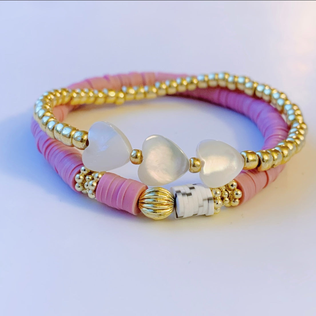 Our BE MINE STACK is made with high quality beads, beautiful 18K Gold plated accents, and naturel shell beads.