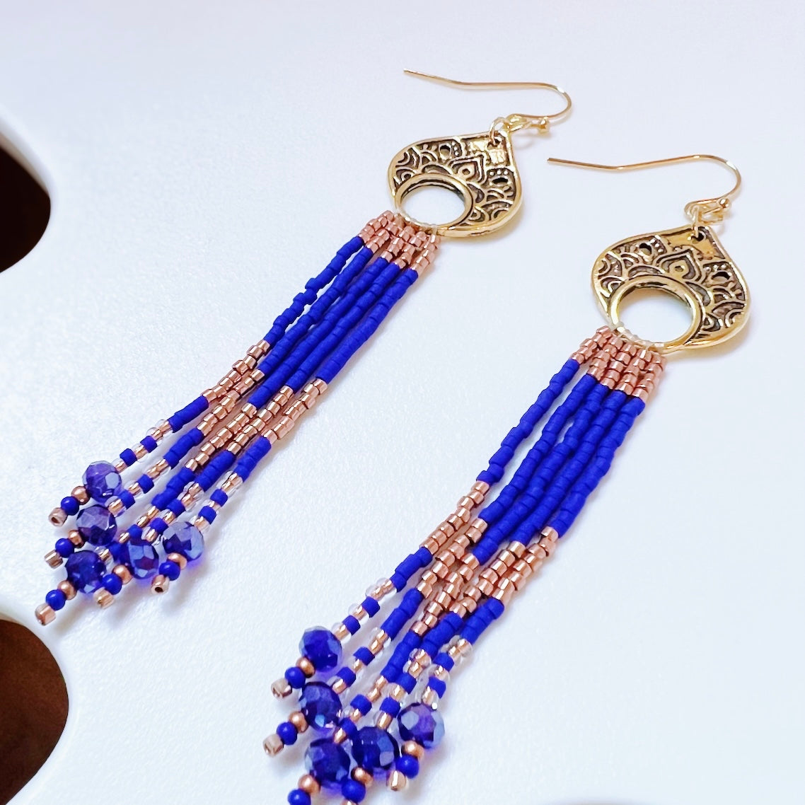 The DESERT NIGHTS earrings feature a high quality metal piece (American made metal) with beautiful fringes handmade with Japanese glass beads.