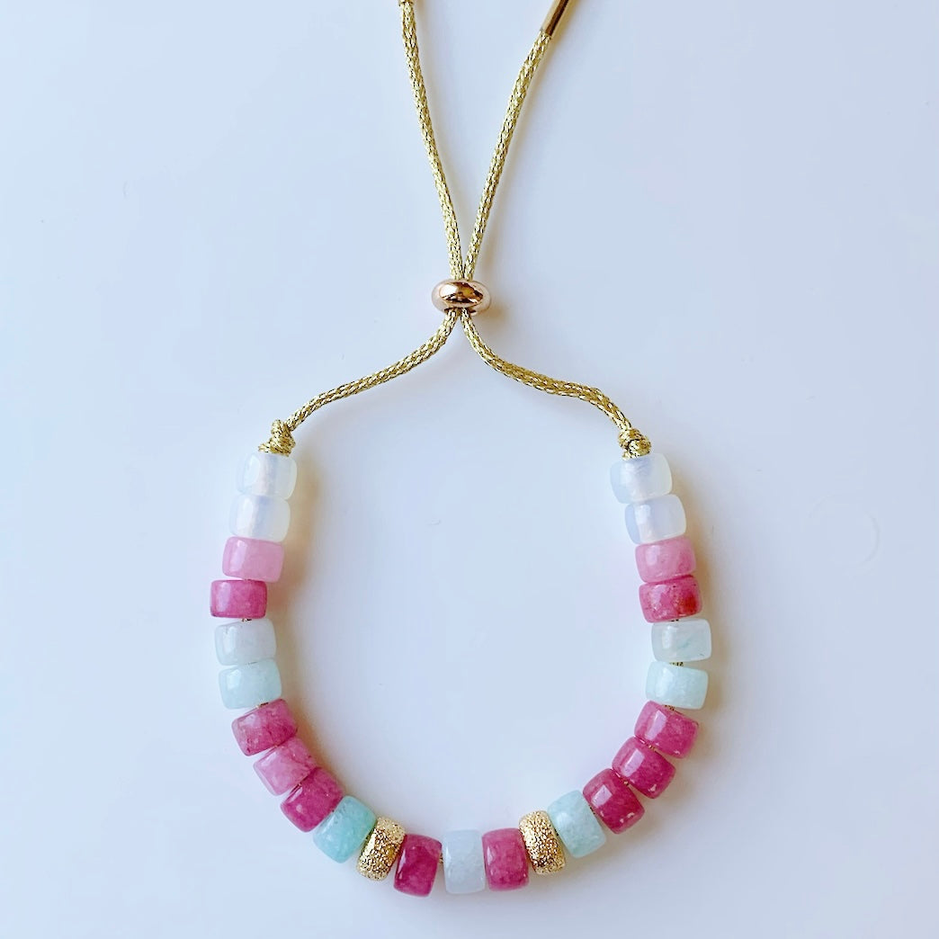 Colorful and Fun, THE TRENDY is made with semi-precious gemstones and gold accents, strung on a high quality cord. This designer inspired bracelet will be your go to jewelry for this summer!