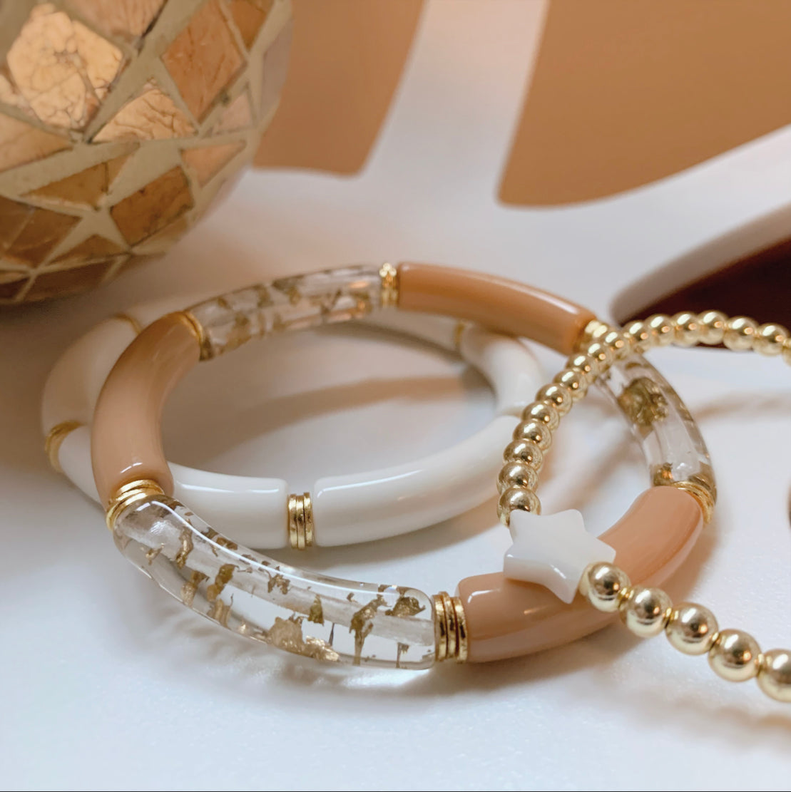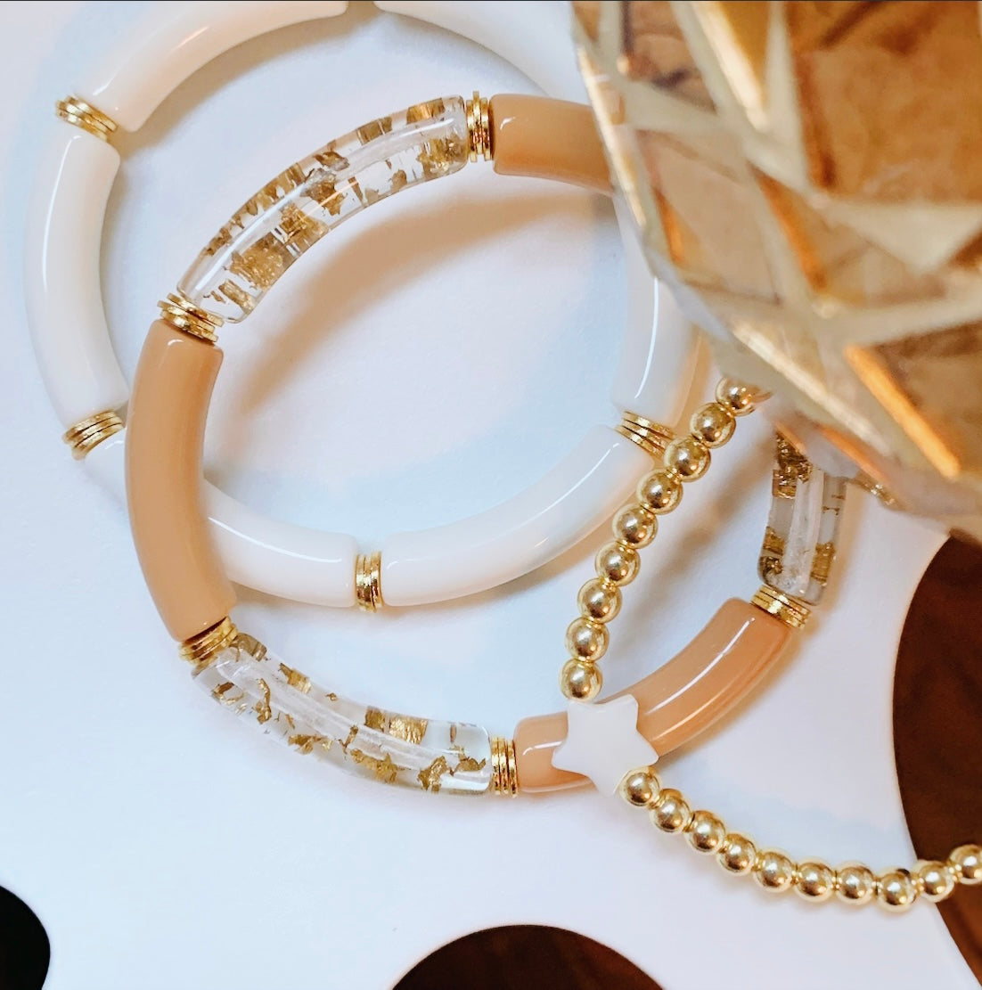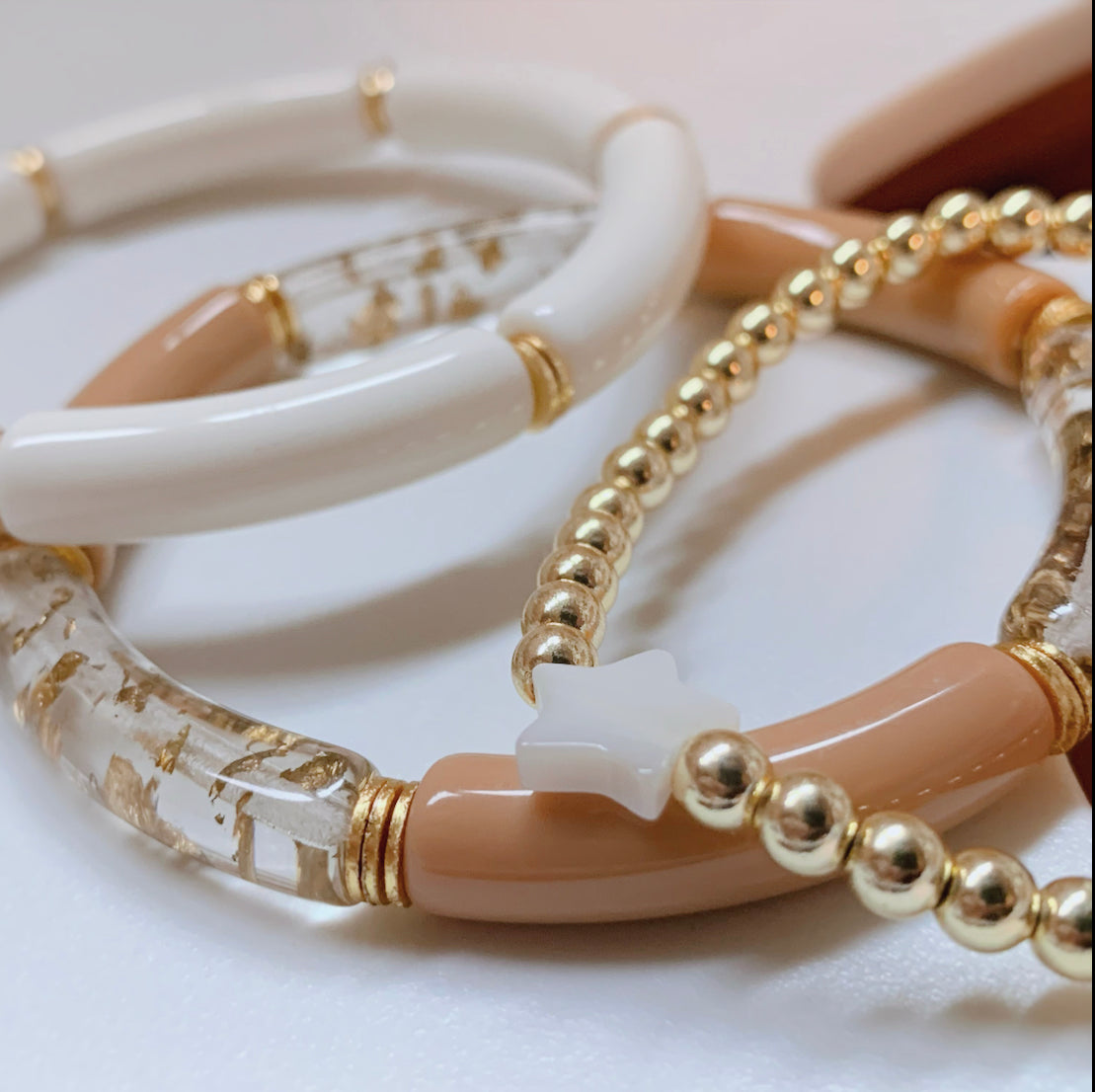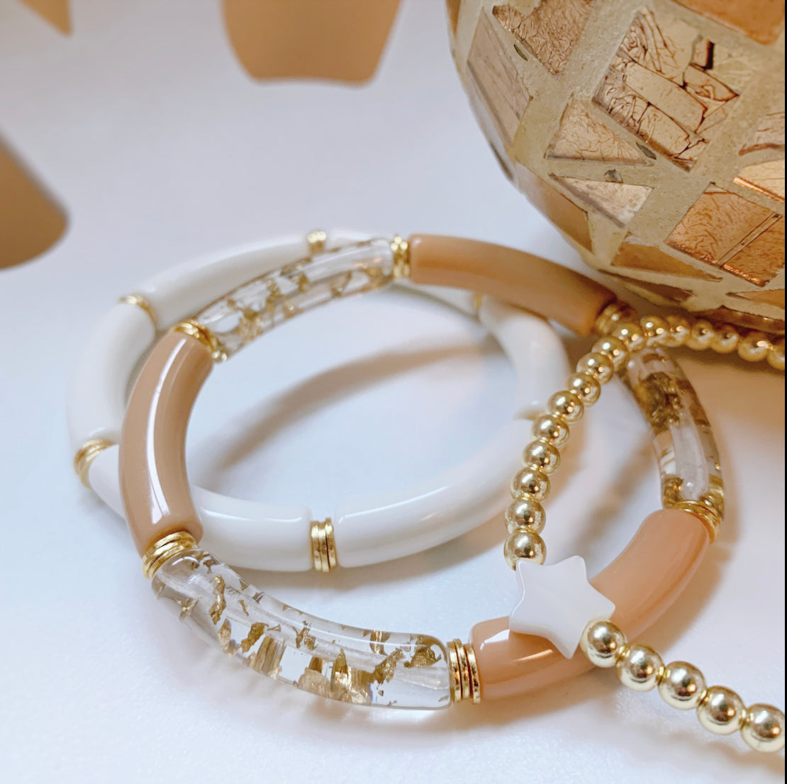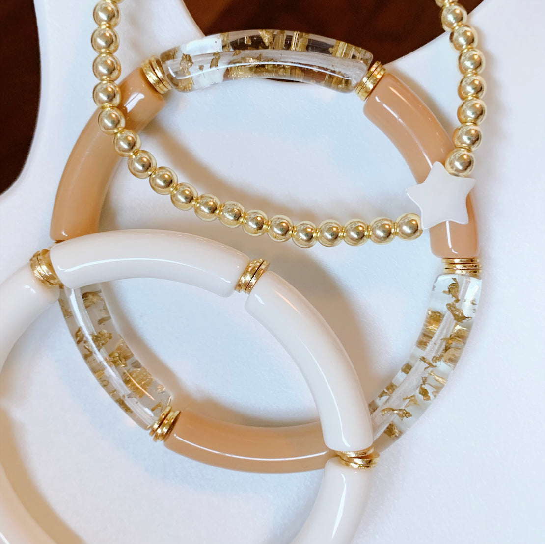 Part of our "Holiday Collection", the GINGERBREAD STACK is made with high quality beads, handmade gold foil beads, natural shell, and 18K Gold plated accents.