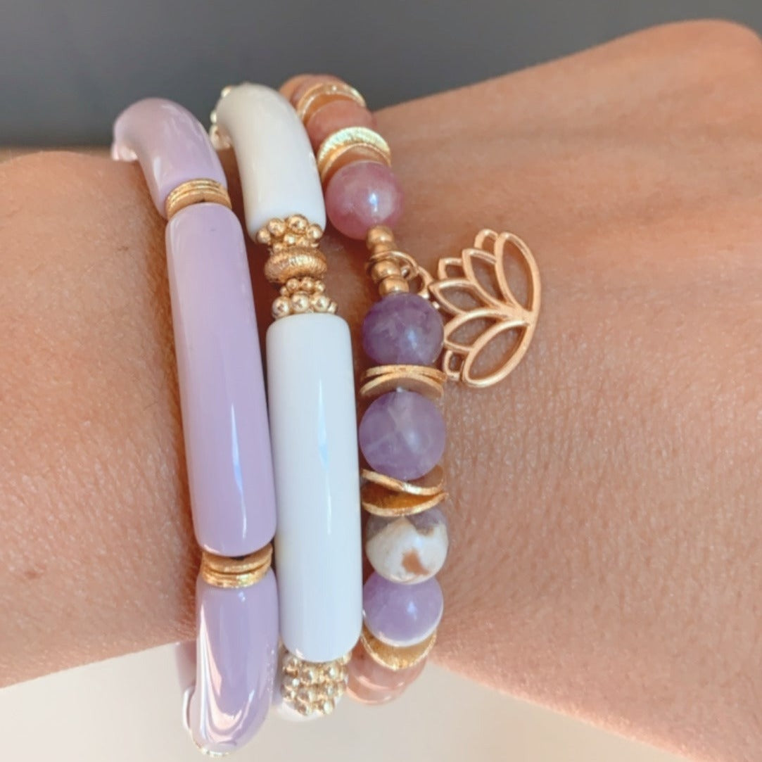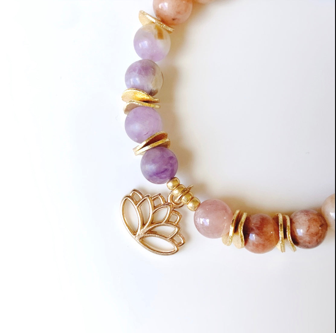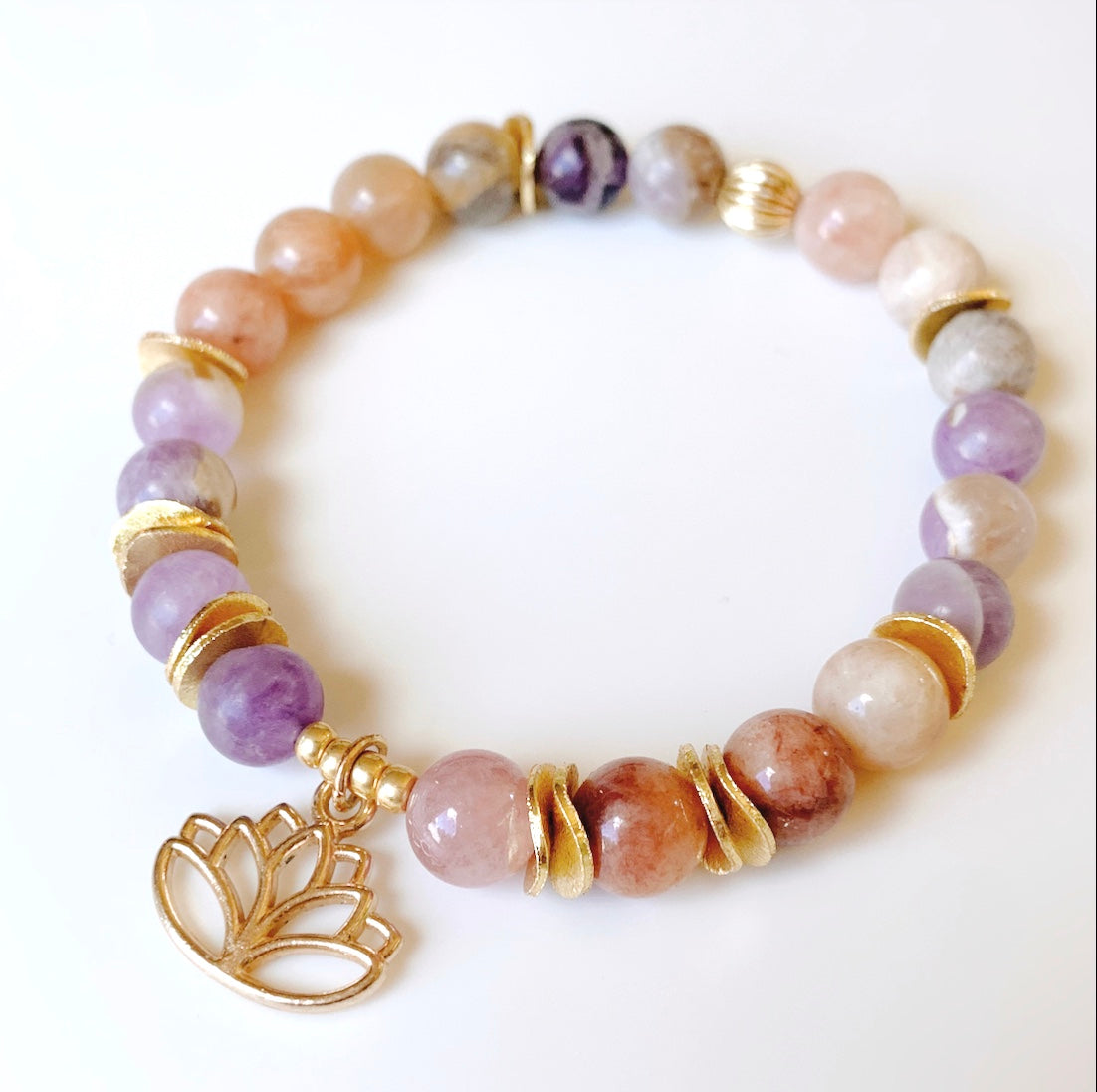The BLOSSOM is a beautiful Semi-Precious Gemstone Bracelet, made with Amethyst and Sunstone. The Lotus charm and gold accents sure add a little Glam to this delicate piece.