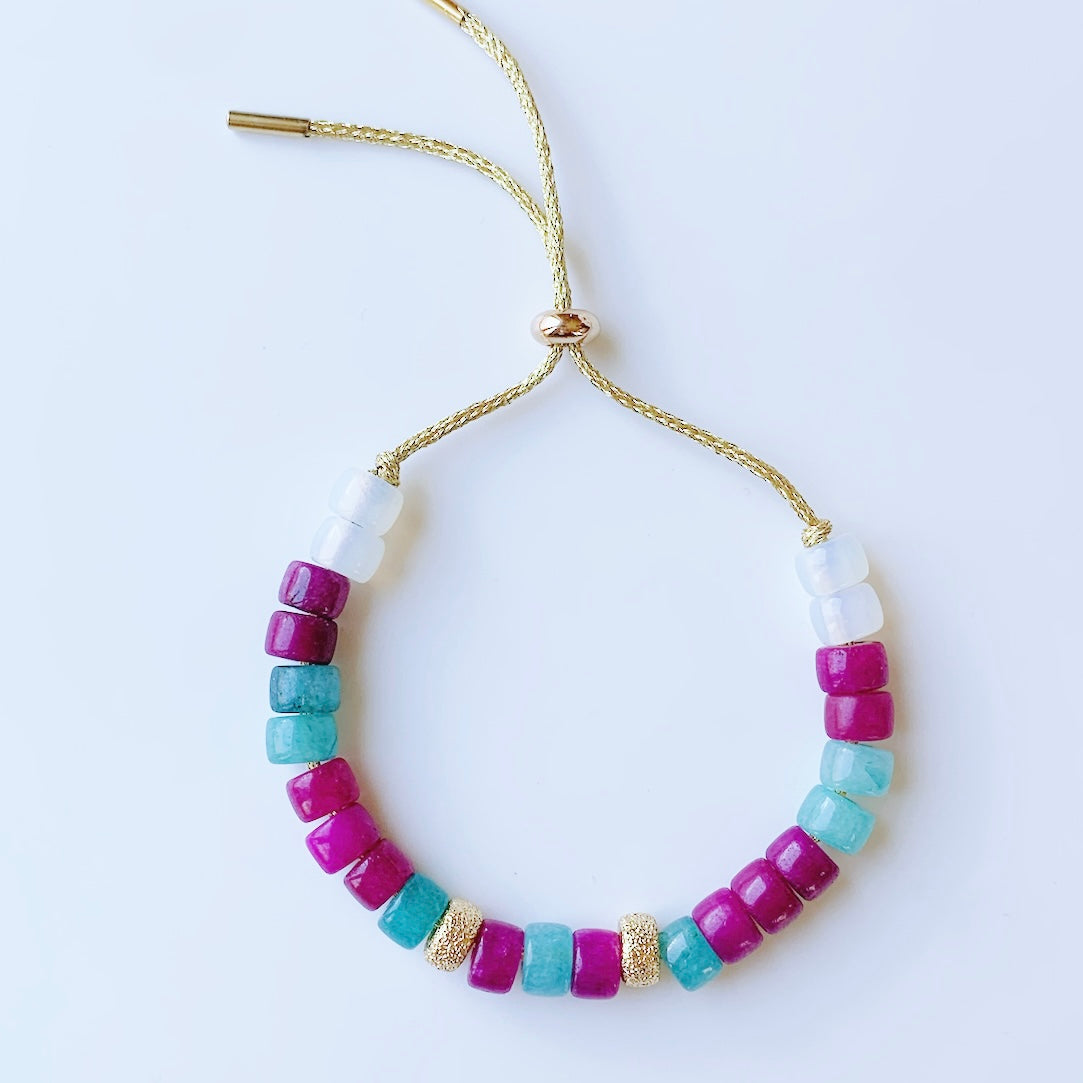 Colorful and Fun, THE TRENDY is made with semi-precious gemstones and gold accents, strung on a high quality cord. This designer inspired bracelet will be your go to jewelry for this summer!