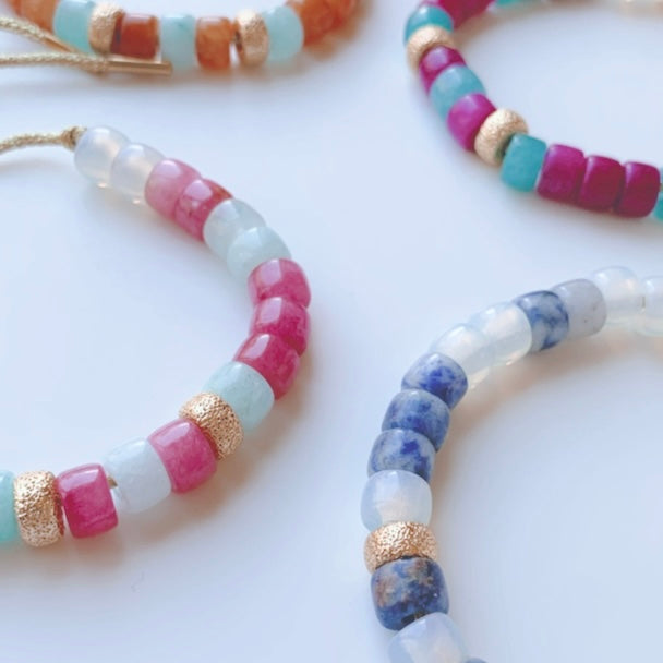 Colorful and Fun, THE TRENDY is made with semi-precious gemstones and gold accents, strung on a high quality cord. This designer inspired bracelet will be your go to jewelry for this summer!