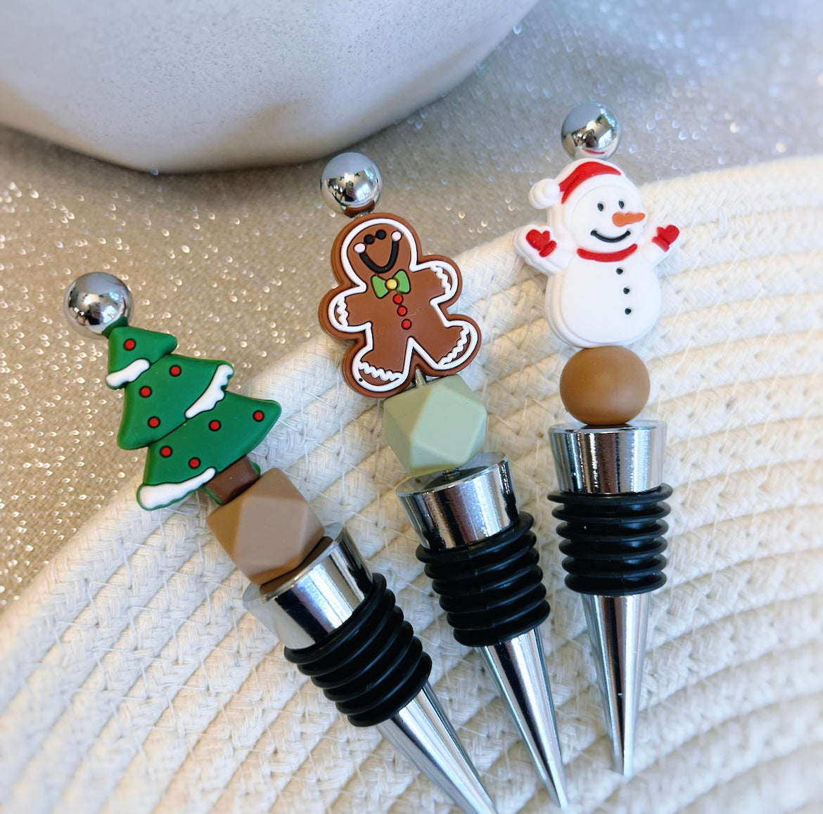 Wine stopper adorned with decorative beads and a Christmas theme charm.